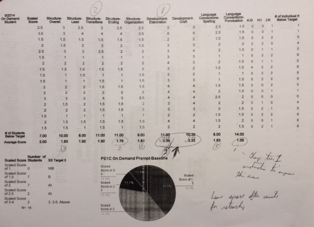 pic26633Then, after teaching the unit while referring often to the rubric and publishing a final draft, use the same prompt you used at the beginning of the unit.  This time, it is important to use the rubric to deeply analyze the writing.  The first thing you will most likely notice is a vast improvement over the initial use of the prompt.  However, if you use the rubric and turn the information into numbers (see image to the right) you will see trends including areas that need specific attention.